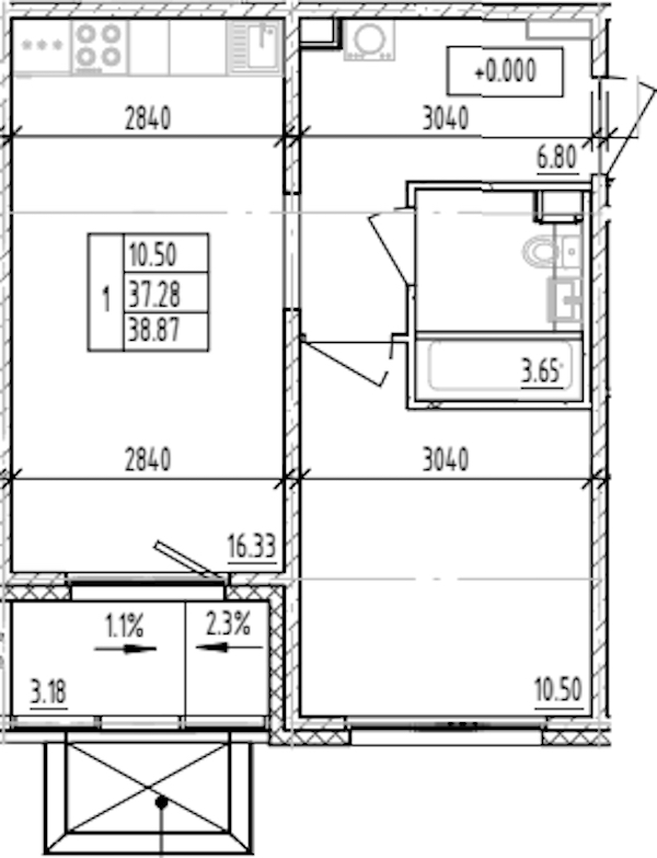 Однокомнатная квартира на 6-ом этаже 38,87 кв.м