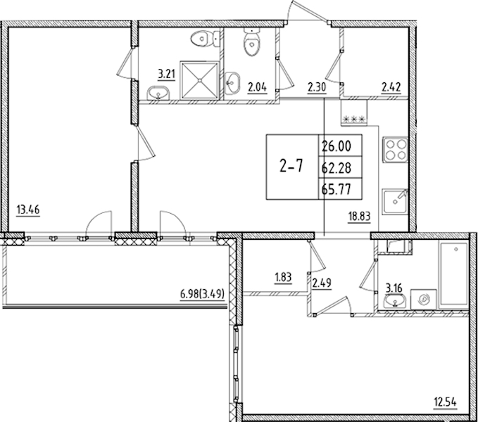 Двухкомнатная квартира на 2-ом этаже 65,77 кв.м