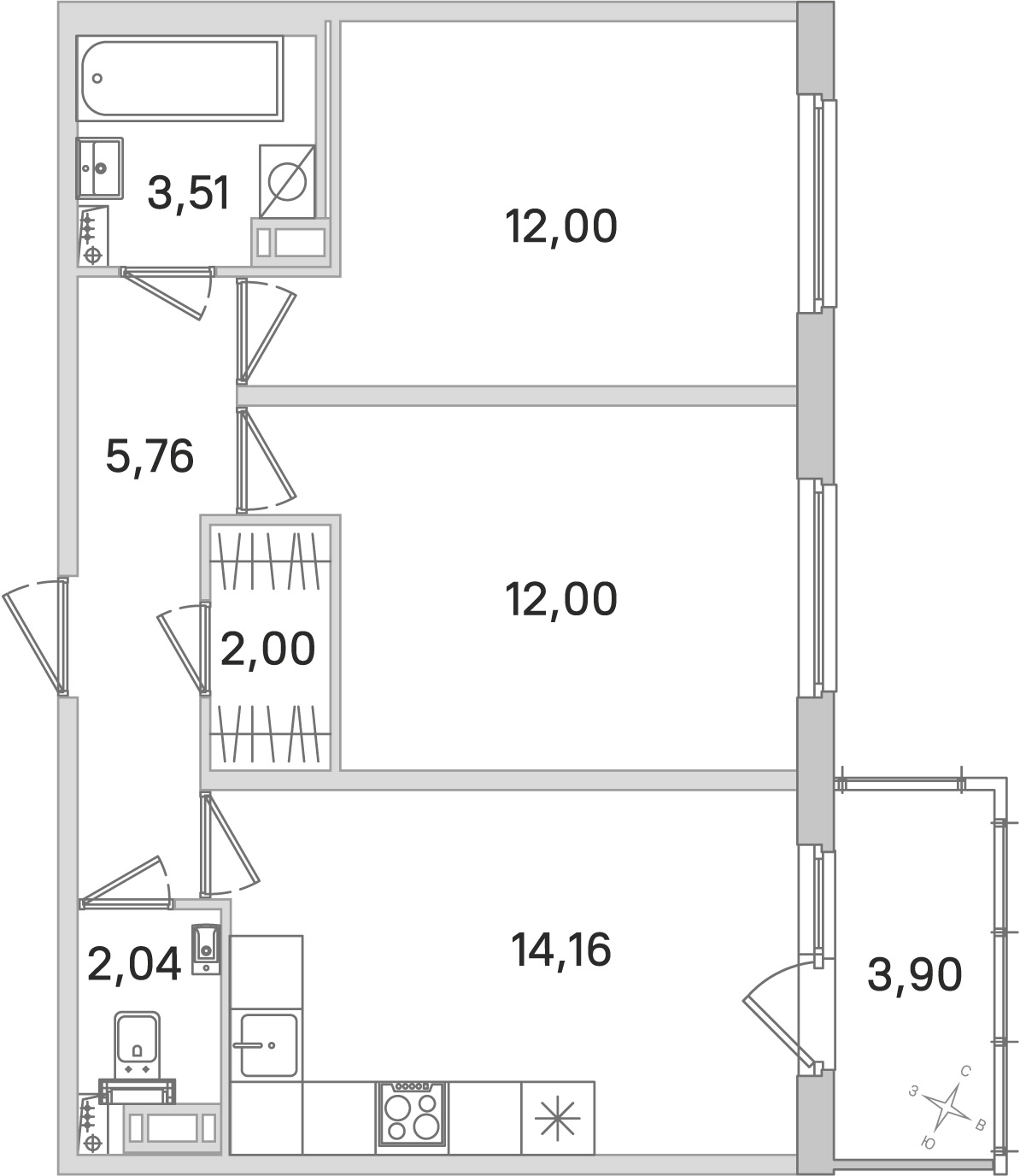Двухкомнатная квартира на 2-ом этаже 51,47 кв.м