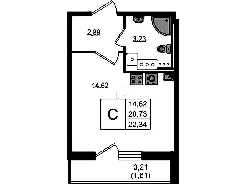 Квартира-студия на 16-ом этаже 22,34 кв.м