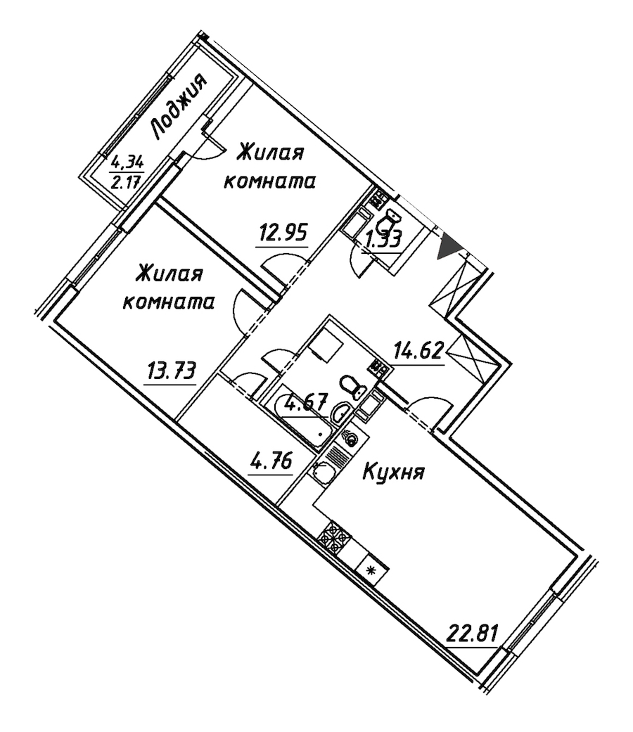 Двухкомнатная квартира на 9-ом этаже 77,04 кв.м