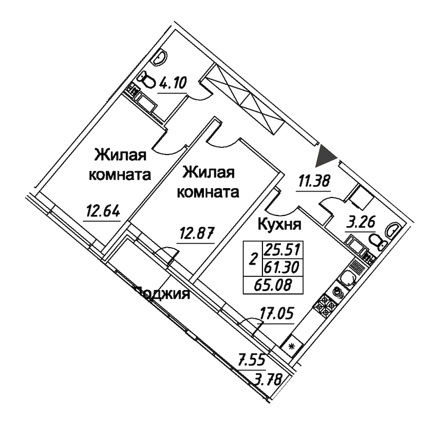 Двухкомнатная квартира на 9-ом этаже 65,08 кв.м
