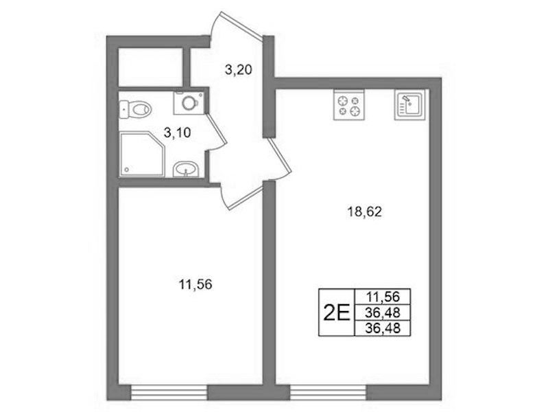 Однокомнатная квартира на 11-ом этаже 36,48 кв.м