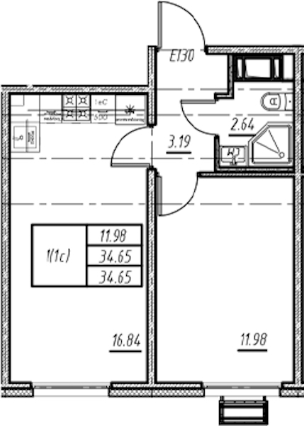 Однокомнатная квартира на 17-ом этаже 34,65 кв.м