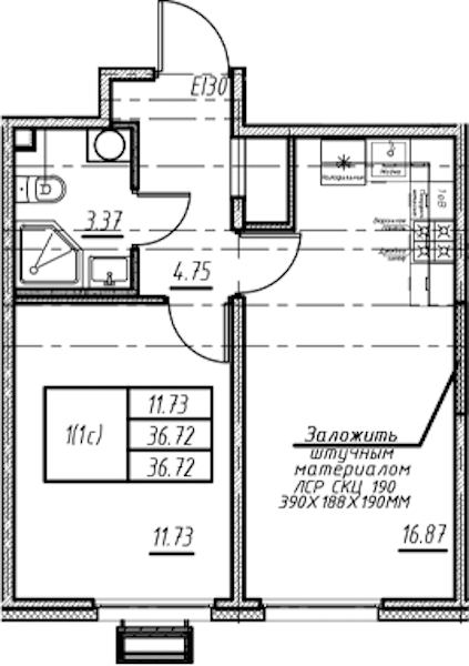 Однокомнатная квартира на 12-ом этаже 36,72 кв.м