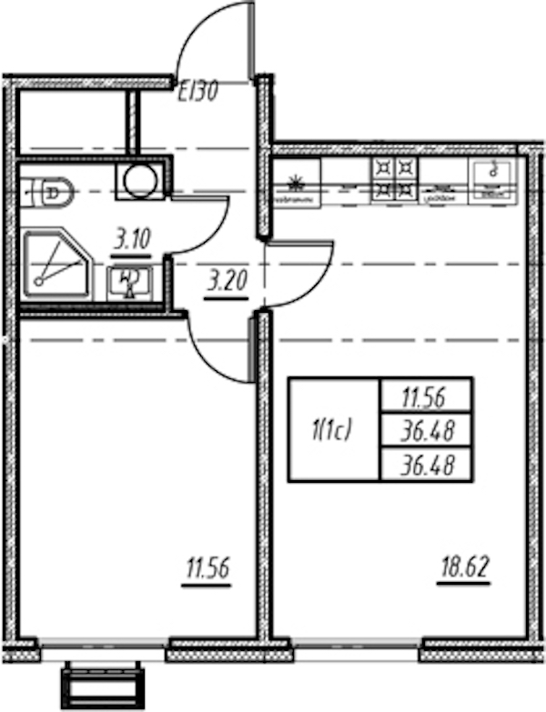 Однокомнатная квартира на 22-ом этаже 36,5 кв.м