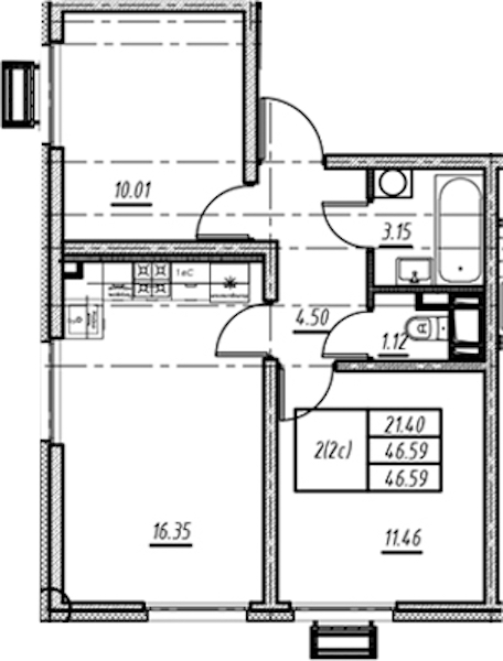 Двухкомнатная квартира на 4-ом этаже 46,59 кв.м
