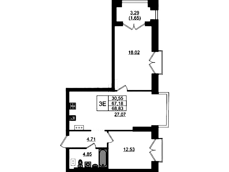 Двухкомнатная квартира на 11-ом этаже 68,83 кв.м