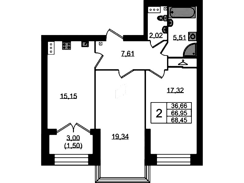 - Площадь кухни15,15 м2