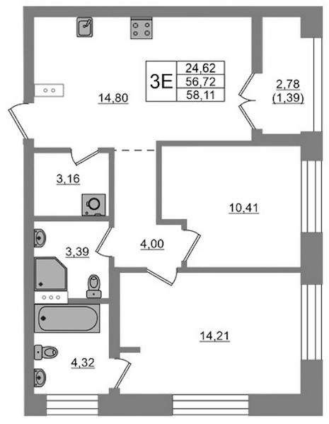 Двухкомнатная квартира на 3-ем этаже 58,11 кв.м