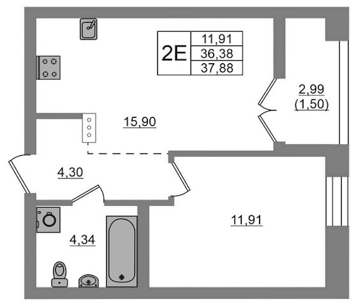- Площадь37,88 м2