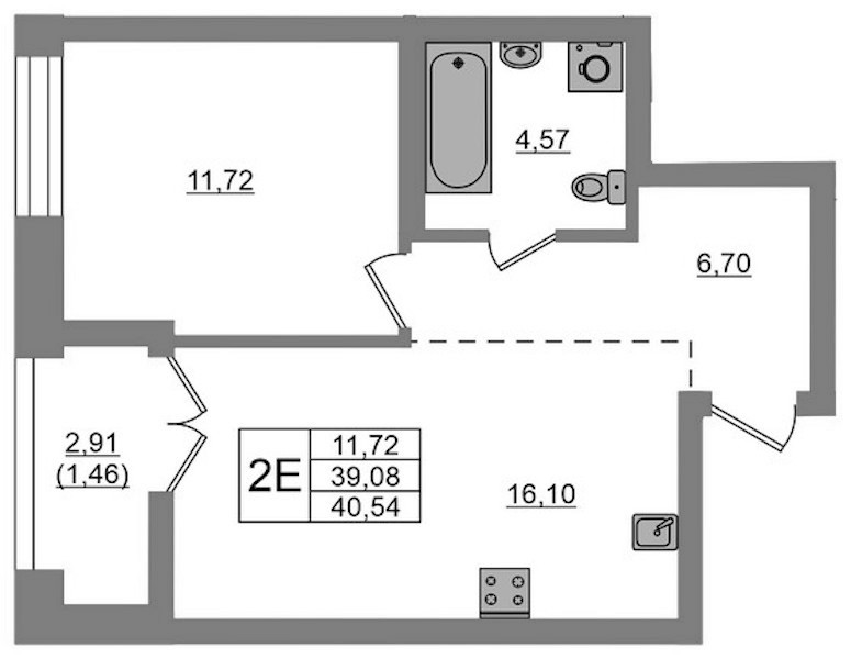 Однокомнатная квартира на 2-ом этаже 40,54 кв.м