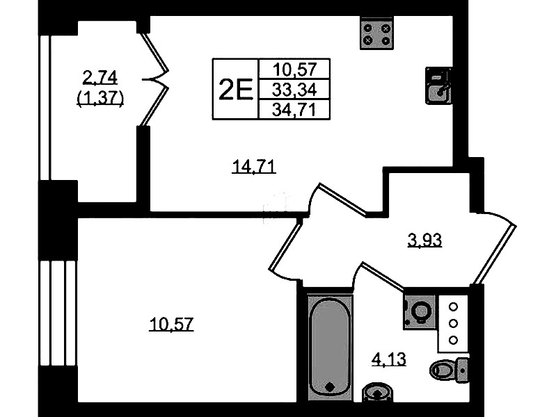 Однокомнатная квартира на 5-ом этаже 34,71 кв.м