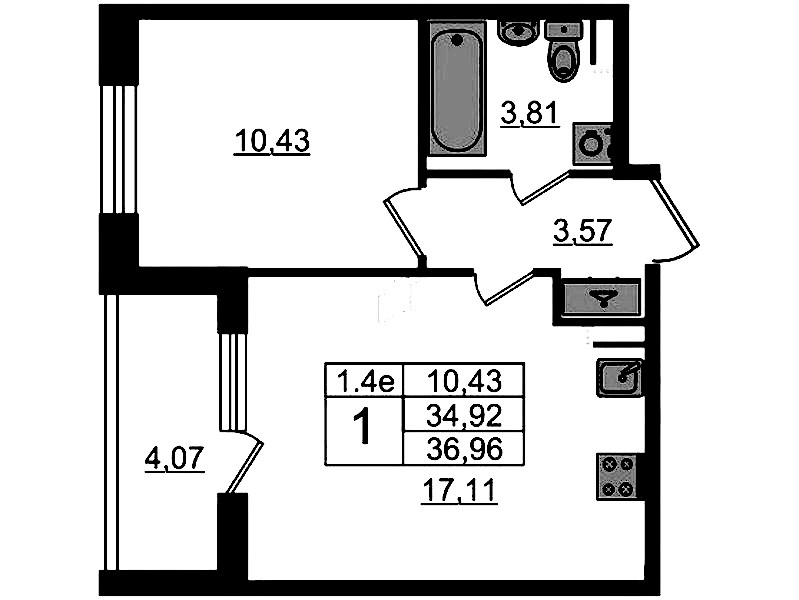 Однокомнатная квартира на 3-ем этаже 34,92 кв.м