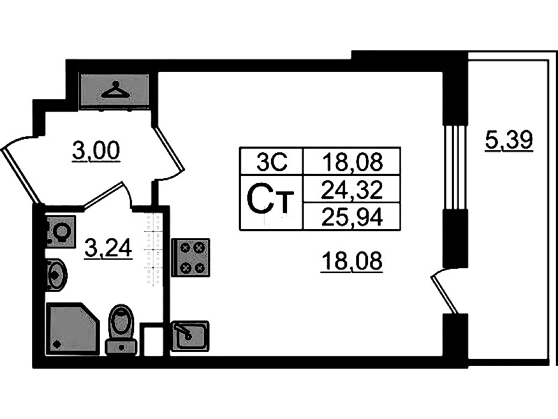 Квартира-студия на 5-ом этаже 24,32 кв.м