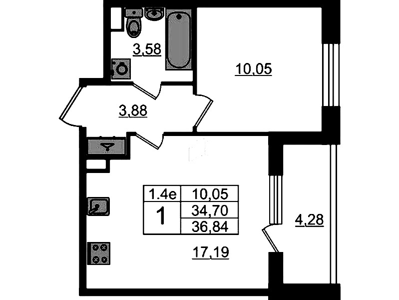 Однокомнатная квартира на 1-ом этаже 34,7 кв.м