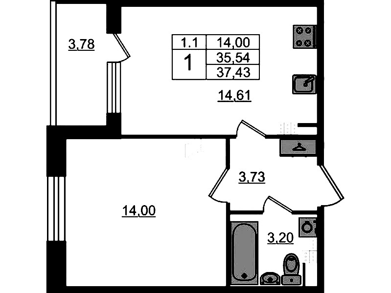 Однокомнатная квартира на 4-ом этаже 35,54 кв.м