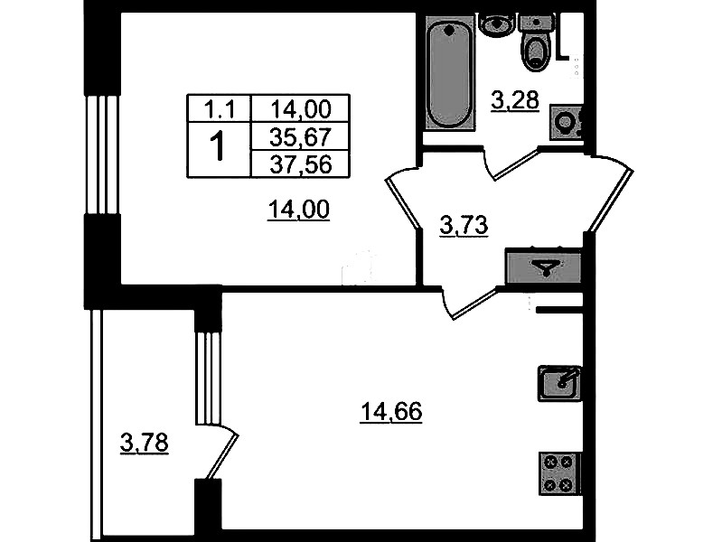 Однокомнатная квартира на 2-ом этаже 35,67 кв.м