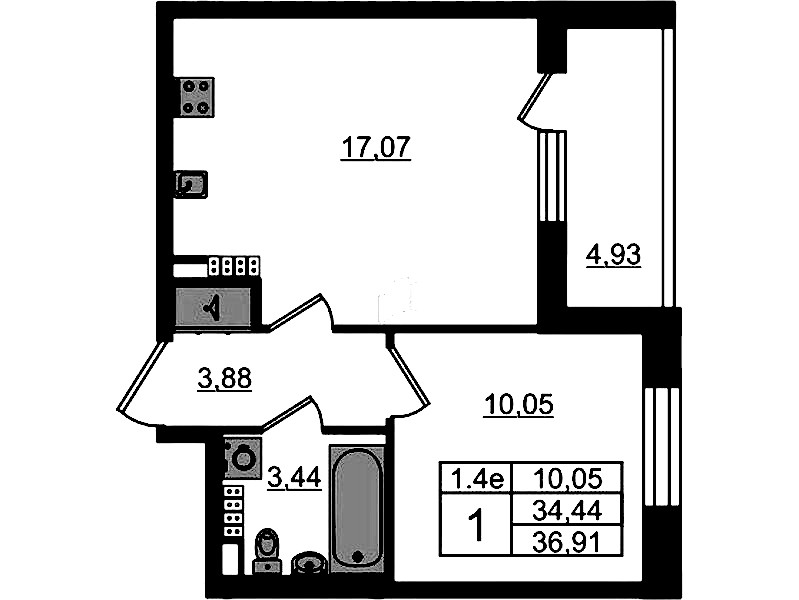 Однокомнатная квартира на 5-ом этаже 34,44 кв.м