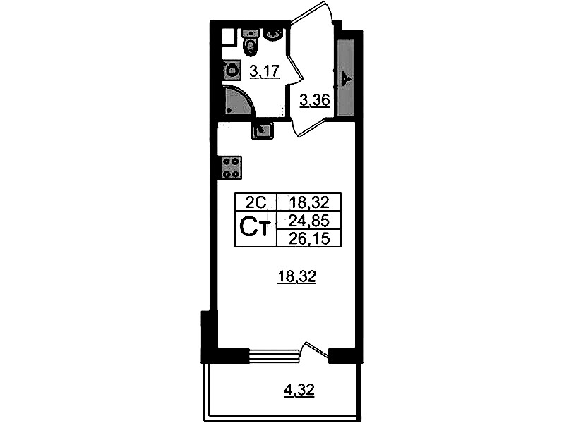 Квартира-студия на 2-ом этаже 24,85 кв.м