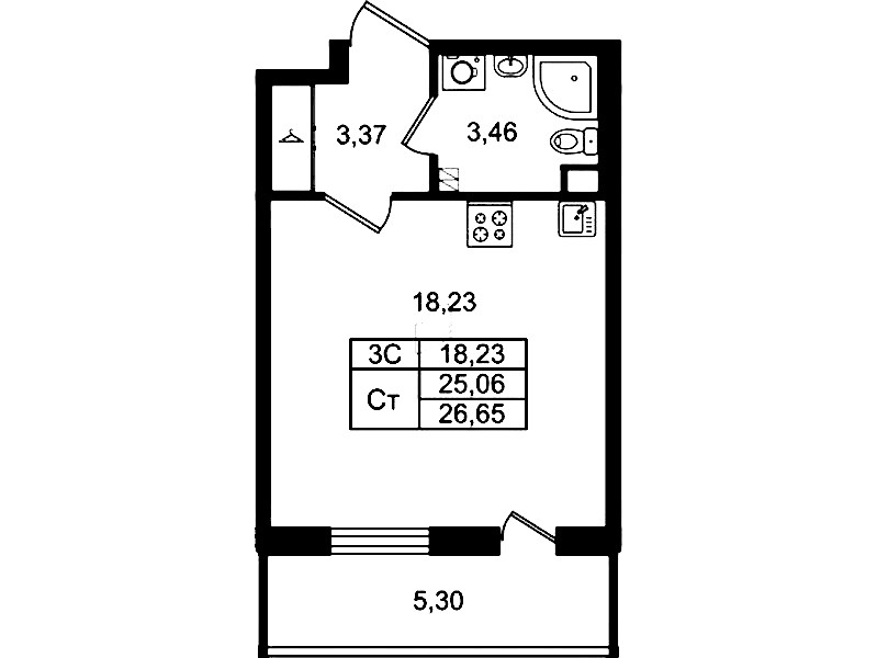 Квартира-студия на 2-ом этаже 25,06 кв.м