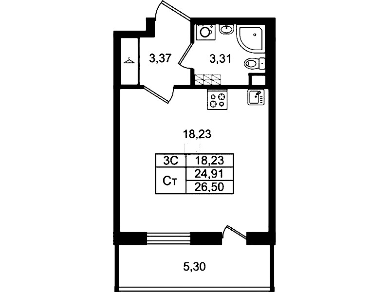 Квартира-студия на 5-ом этаже 24,91 кв.м