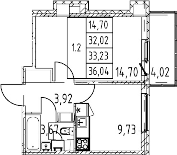 - Площадь кухни9,73 м2