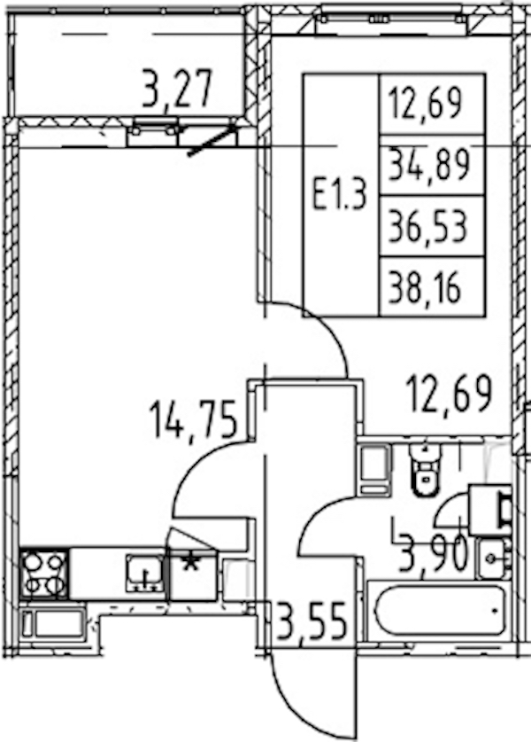 Однокомнатная квартира на 12-ом этаже 34,89 кв.м