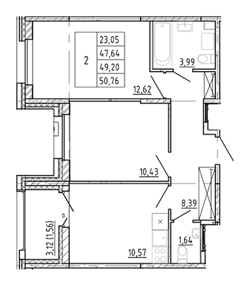 Двухкомнатная квартира на 12-ом этаже 47,64 кв.м