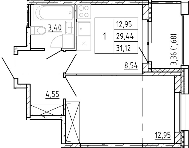 Однокомнатная квартира на 11-ом этаже 29,44 кв.м