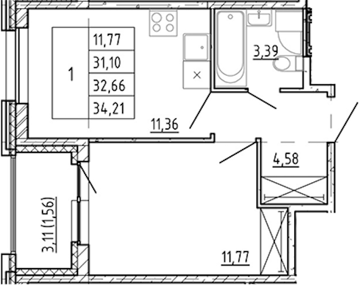 Однокомнатная квартира на 10-ом этаже 31,1 кв.м
