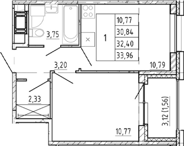 Однокомнатная квартира на 3-ем этаже 30,84 кв.м