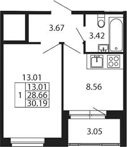 Однокомнатная квартира на 6-ом этаже 28,66 кв.м