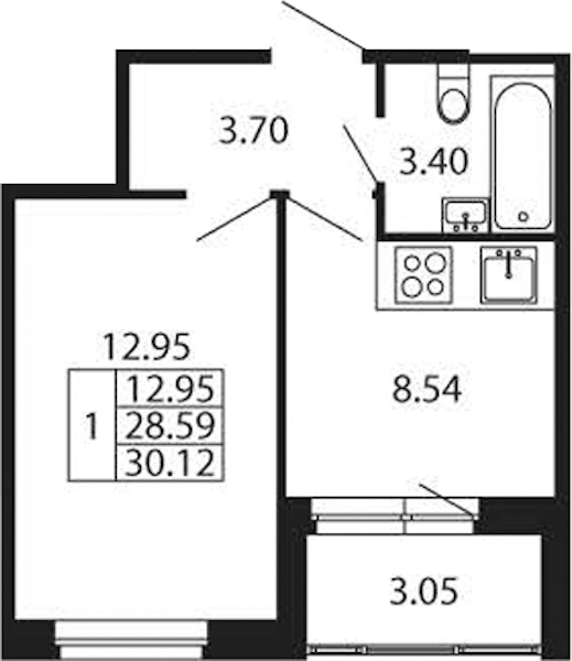 Однокомнатная квартира на 3-ем этаже 28,59 кв.м