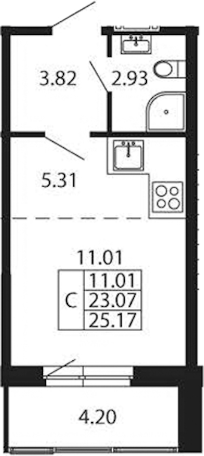 Квартира-студия на 6-ом этаже 23,07 кв.м