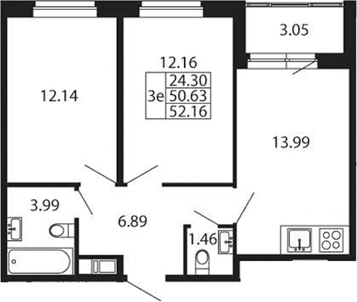 Двухкомнатная квартира на 3-ем этаже 50,63 кв.м