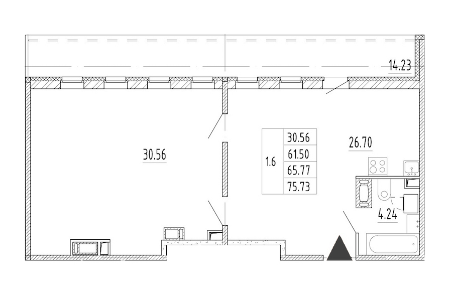 Однокомнатная квартира на 11-ом этаже 61,5 кв.м