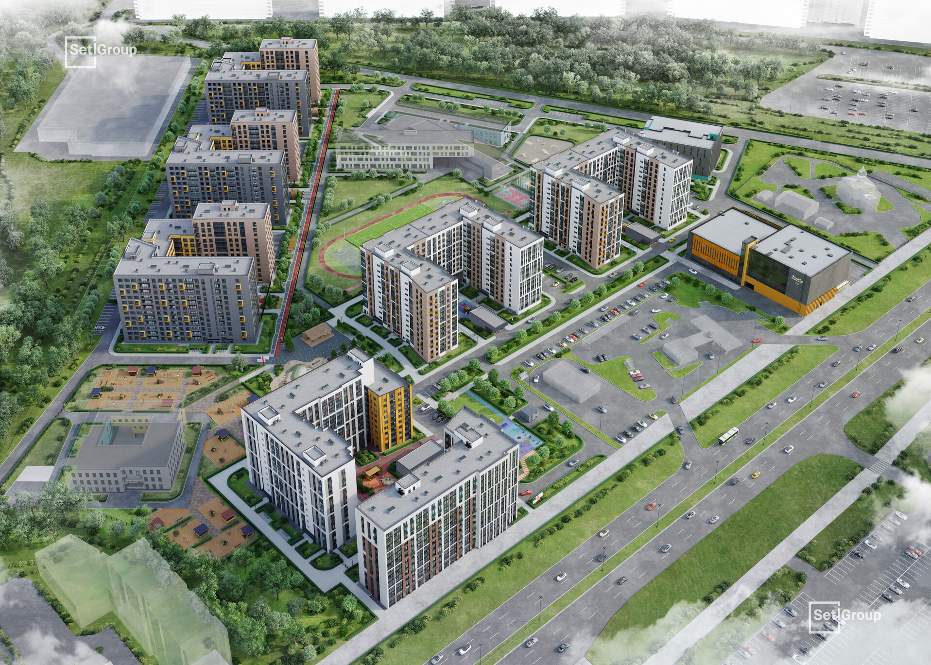 В самом сердце проекта будет большое креативное пространство для отдыха детей и взрослых. Предусмотрен игровой парк SetlKids с качелями, беседками и навесами. Зонами притяжения станут «парящий» лунный мост с качелями и липовая аллея. Устраивать уютные прогулки жители смогут по променаду вдоль домов, обращенных к Шуваловскому карьеру. Вдоль пешеходного бульвара появится оборудованная специальным покрытием тренировочная дорожка для детей. На ней будет удобно обучаться катанию на роликах или велосипедах. В свободных от машин дворах-патио жителей порадуют зоны для спокойного отдыха и места для настольных игр. Для любителей спорта на свежем воздухе появится большая площадка SetlSport, а также площадки для волейбола и баскетбола.