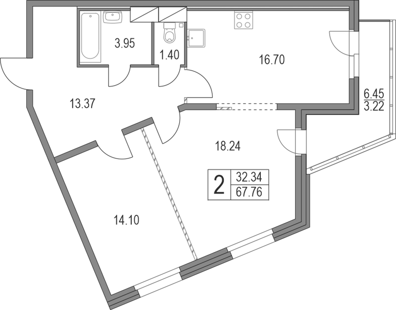 Двухкомнатная квартира на 3-ем этаже 67,76 кв.м