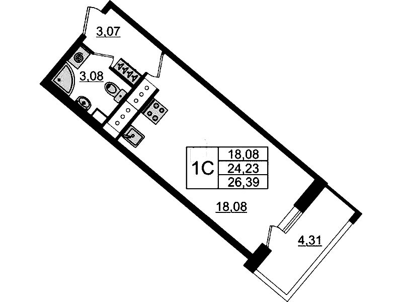 Квартира-студия на 3-ем этаже 24,4 кв.м