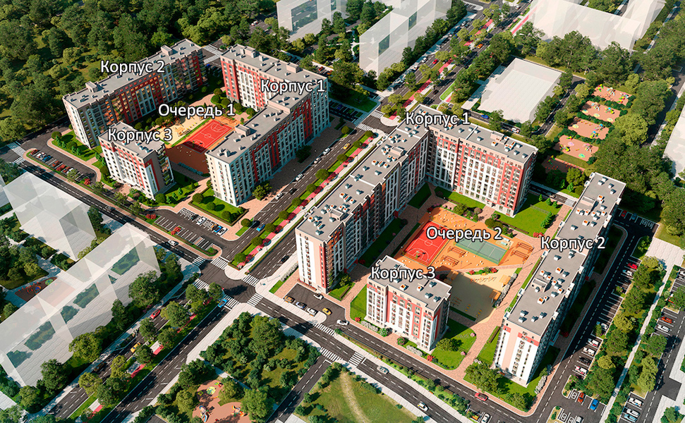 Благоустроенная территория жилого квартала включает в себя обустроенные места для отдыха, спорта и игр для детей. Авторский ландшафтный дизайн предполагает высадку деревьев и кустарников различных видов. Внутренние дворы будут закрыты от машин, все открытые машиноместа вынесены за периметр комплекса.
