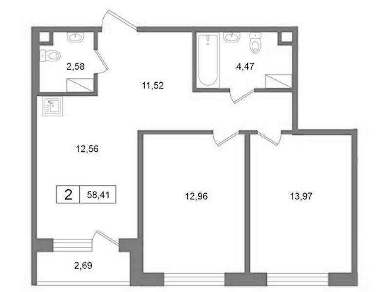 Двухкомнатная квартира на 3-ем этаже 58,41 кв.м