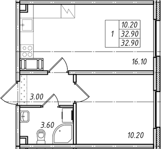 Однокомнатная квартира на 9-ом этаже 32,9 кв.м