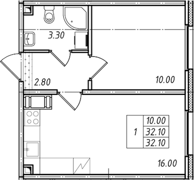 Однокомнатная квартира на 14-ом этаже 32,1 кв.м
