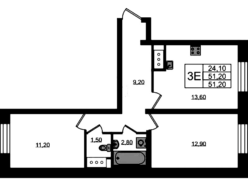 Двухкомнатная квартира на 12-ом этаже 51,2 кв.м