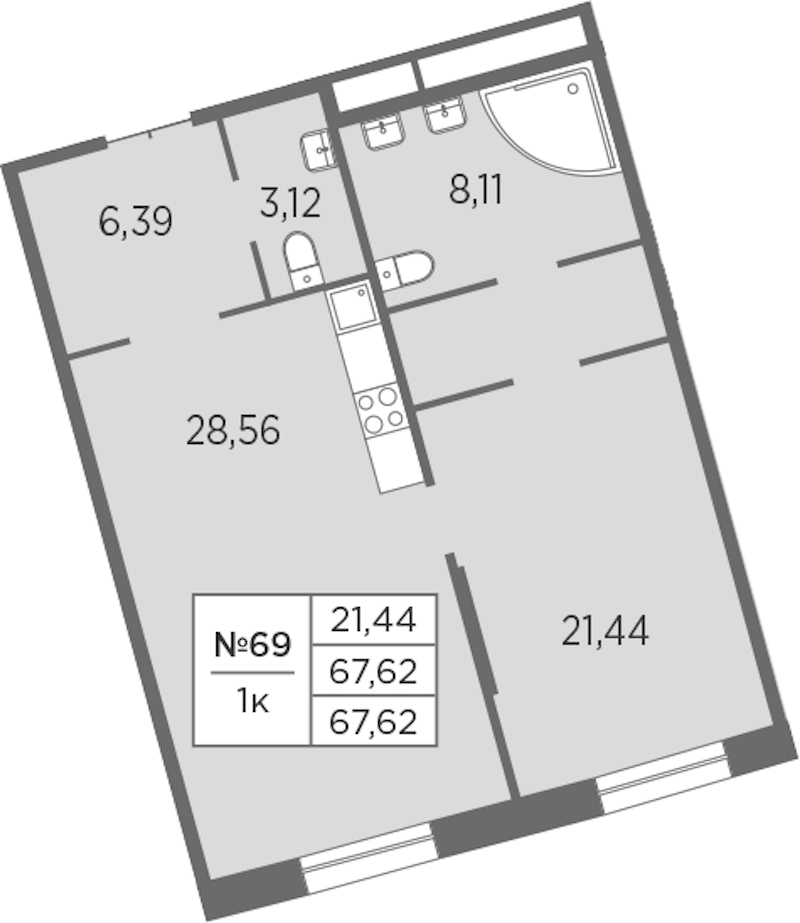 Однокомнатная квартира на 2-ом этаже 67,62 кв.м