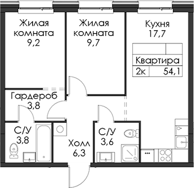 Двухкомнатная квартира на 9-ом этаже 54,1 кв.м