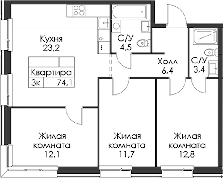 - Площадь74,1 м2