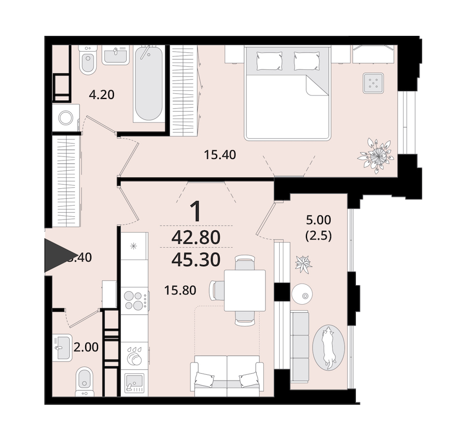 - Площадь45,3 м2