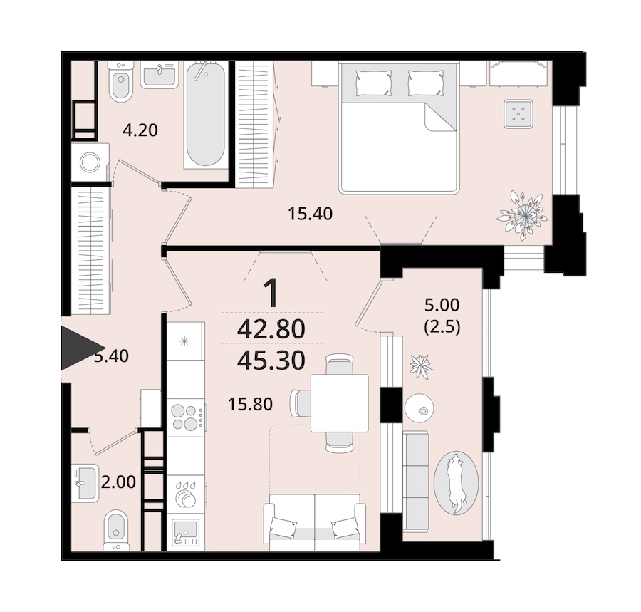 Однокомнатная квартира на 5-ом этаже 45,3 кв.м